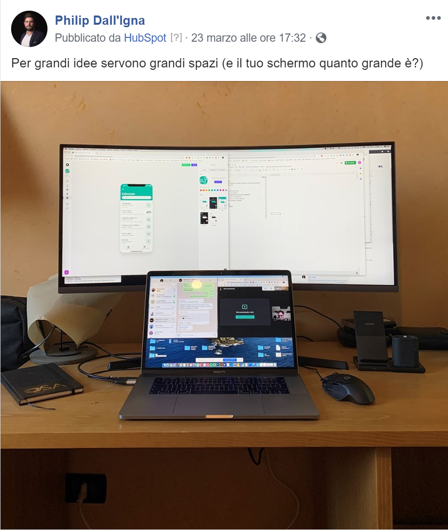 Come puoi vedere sopra, ho inserito una foto del mio setup per lavorare da casa e questo è un contenuto che attira l’attenzione, soprattutto in questo periodo di quarantena (sto scrivendo il 27 febbraio 2020 durante l’emergenza sanitaria Covid-19) in cui tutti sono costretti a lavorare da casa.